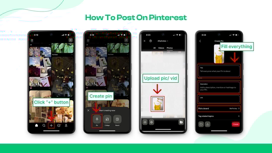 For computers, click the “+” button and then “Create Pin,” upload your picture or video, enter title, description, destination link, and assign to a board before publishing. For smartphones, tap the “+” button on the Pinterest app, choose Pin, select media, fill in details, link to a destination, and publish.