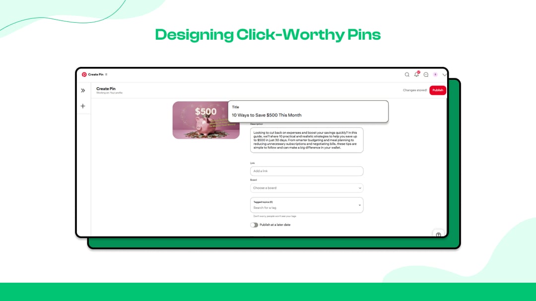 Example: If you create your Pin with the title “10 Ways to Save $500 This Month” and use a bold text overlay and clean imagery, it will attract more clicks than just a stock photo of a piggy bank.