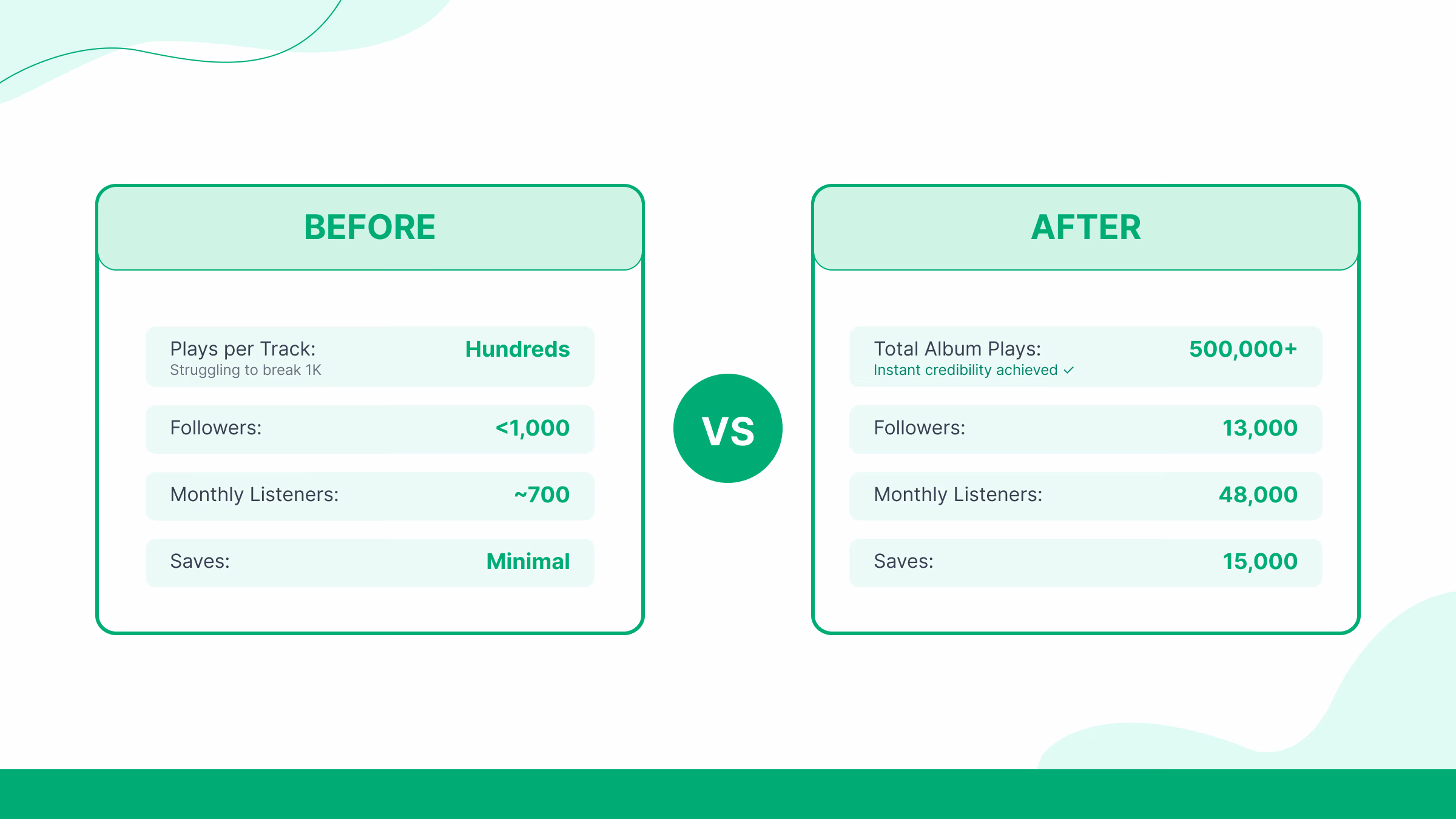 This case study highlights a common struggle: great music isn’t enough without visibility. Spotify’s algorithm rewards traction, and without plays, saves, and followers, even excellent albums go unnoticed.