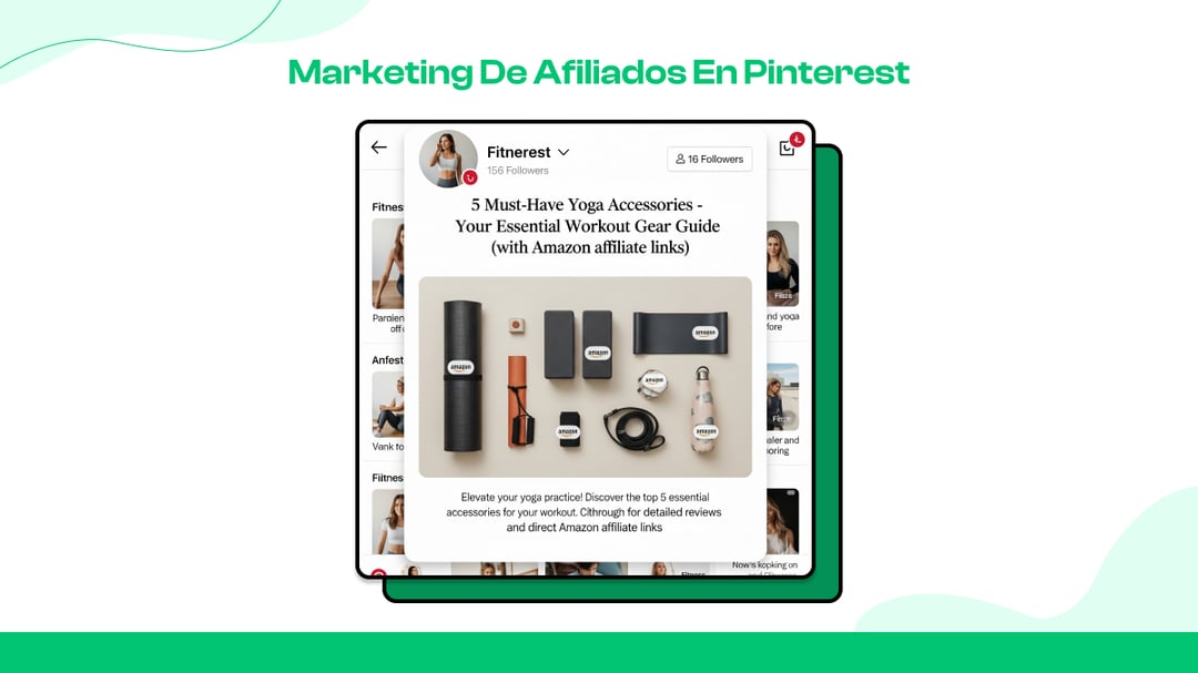 Ejemplo: supongamos que eres un creador de contenido en el nicho del fitness que hace guías de equipo de entrenamiento. Solo puedes incluir enlaces de afiliados que lleven a los usuarios a los productos de Amazon a tu pin «5 accesorios de yoga imprescindibles». Cualquier venta que se genere a partir de tu enlace te llevará a ganar dinero.