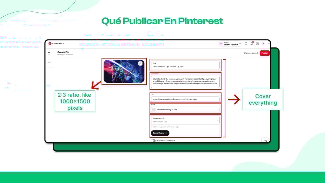 Opta por imágenes verticales y de alta calidad (idealmente con una proporción de 2:3, como 1000 × 1500 píxeles) con títulos claros y atractivos, así como descripciones ricas en palabras clave. Puedes cubrir campos como los temas y las etiquetas, lo que reforzará tu capacidad de descubrimiento y tu clasificación algorítmica en la plataforma.