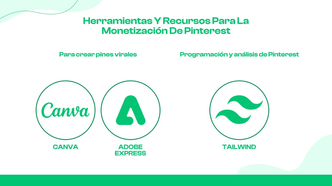 Puedes asegurarte de que tu proceso de creación de contenido y monetización en Pinterest sea mucho más fluido y escalable incorporando las herramientas adecuadas en tu estrategia y proceso. Algunas de las herramientas que puedes usar son: