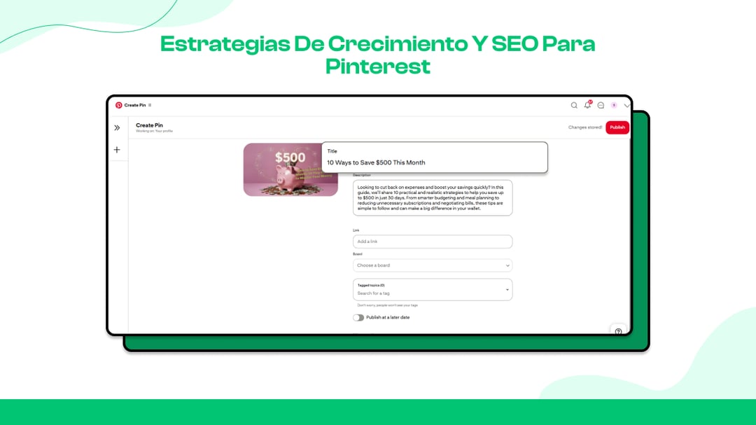 Ejemplo: Si creas tu Pin con el título «10 formas de ahorrar 500$ este mes» y utilizas una superposición de texto en negrita e imágenes limpias, atraerá más clics que una simple foto de archivo de una alcancía.