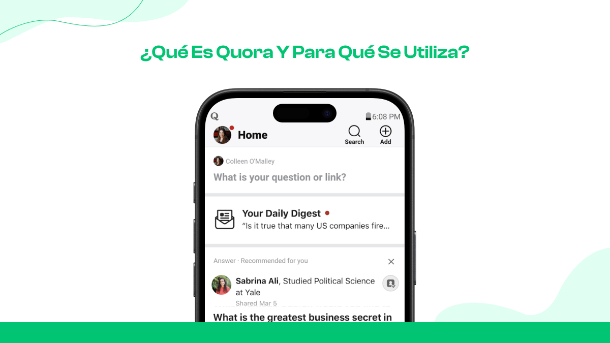 Quora es una plataforma de preguntas y respuestas y tu escenario en línea para convertirte en la autoridad de referencia en tu campo, ya seas un experto en temas individuales, una empresa o un especialista en marketing especializado.
