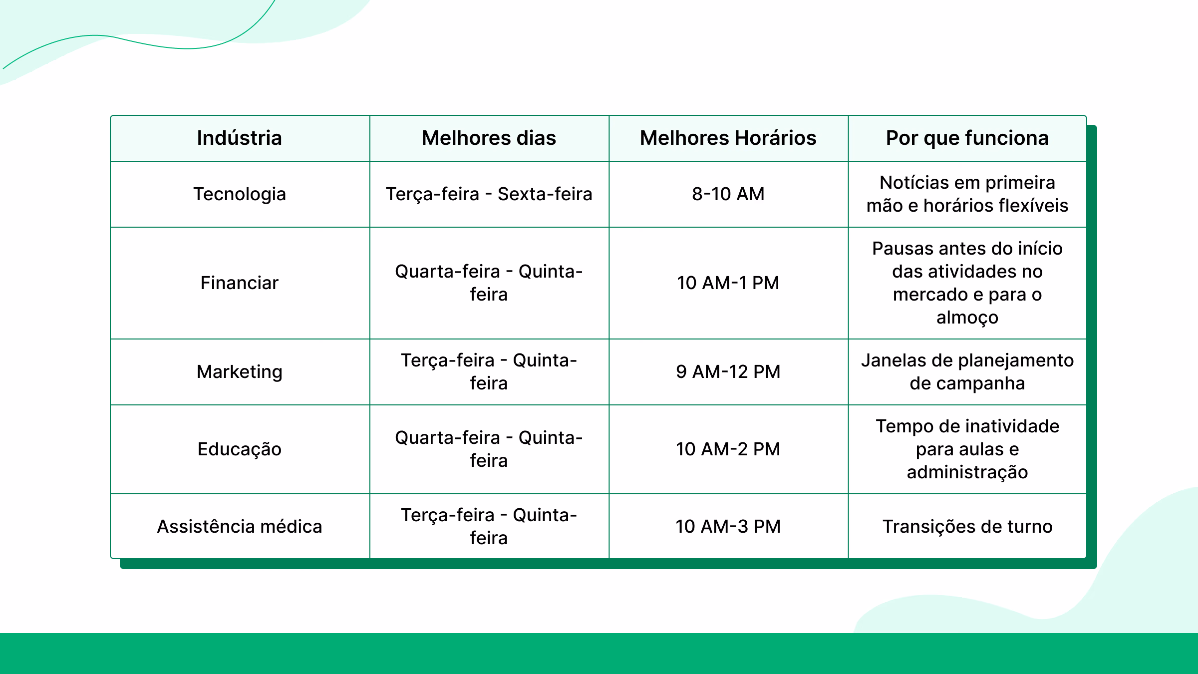 Às vezes, você pode ter um engajamento moderado se publicar durante a noite, mas os primeiros horários do dia de trabalho geralmente são mais confiáveis para esse setor.